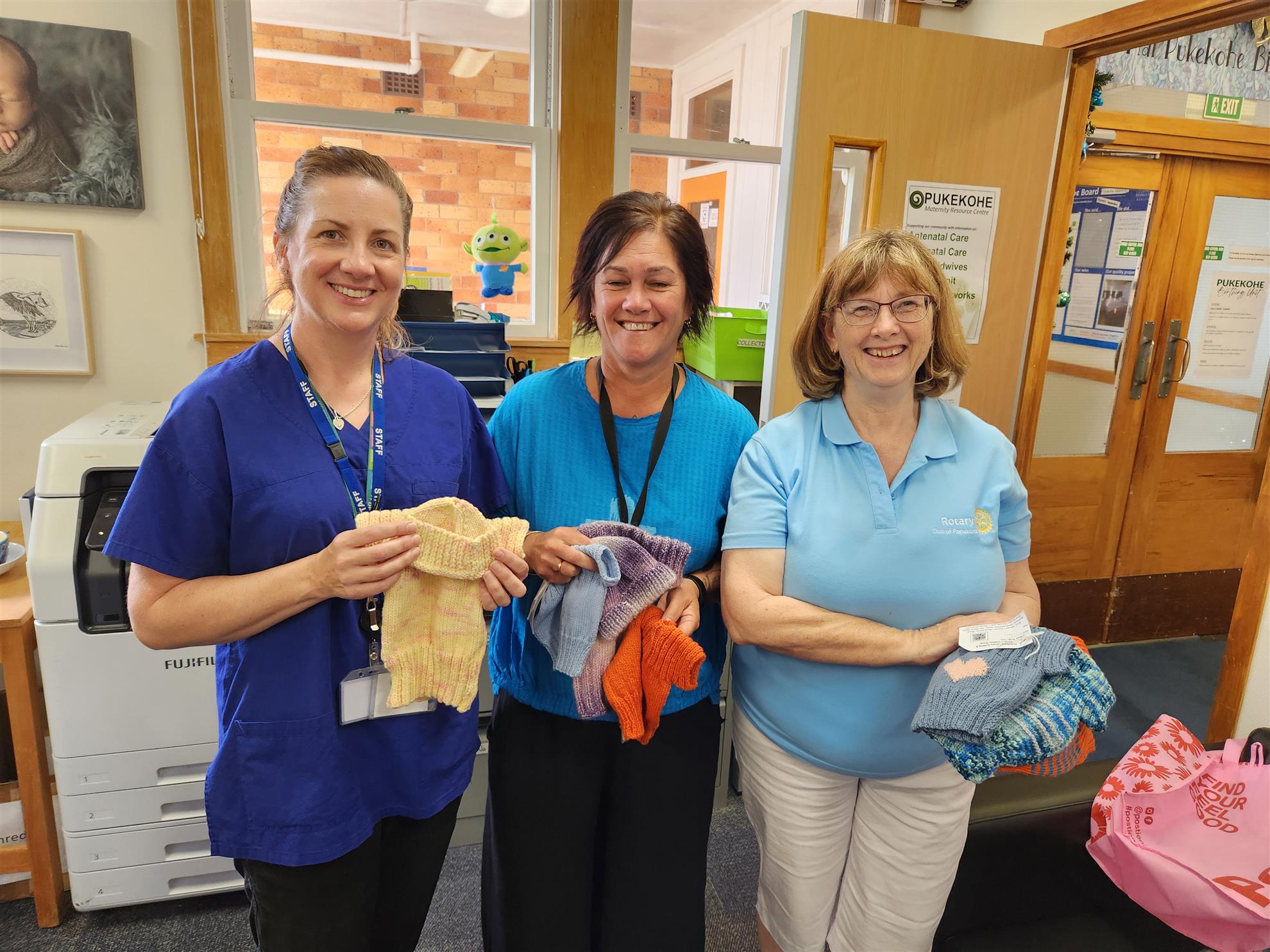 Last year, the Pukekohe knitting group, with wool donated by RC Papakura, created dozens of beautiful items. Rob Dunne and Kathryn Harvey were proud to deliver these handmade gifts to the Pukekohe and Papakura Birthing Centers, where they were warmly received by new mums in need of a little extra warmth and care.